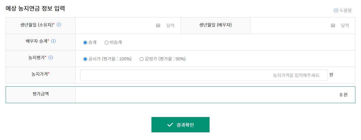 - 소유자 및 배우자의 생년월일과 소유 농지정보의 농지가격을 입력하시면 연금 종류별 예상 연금을 조회할 수 있습니다.